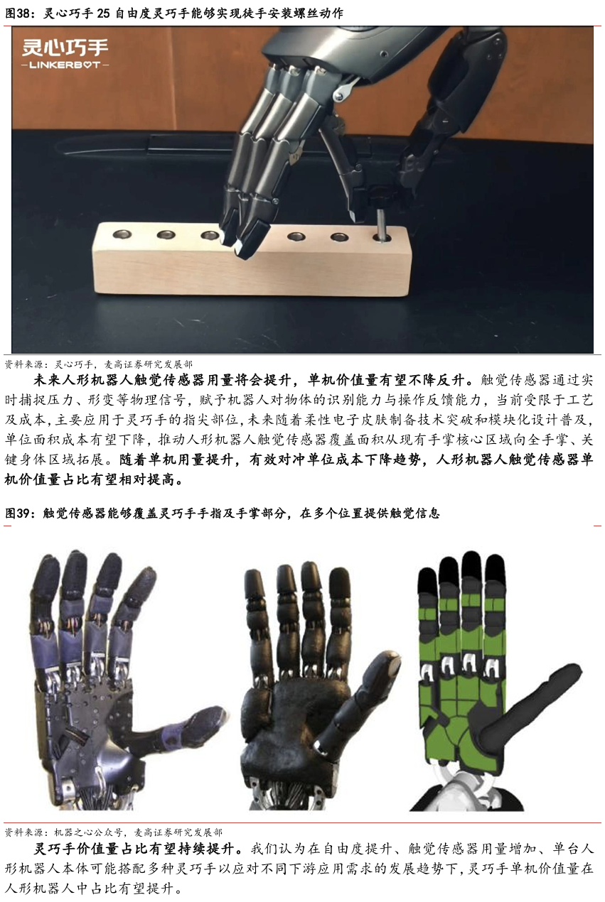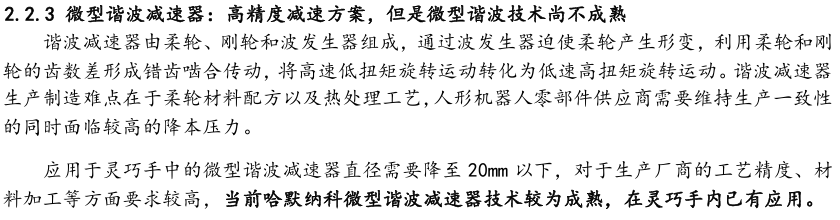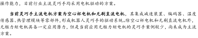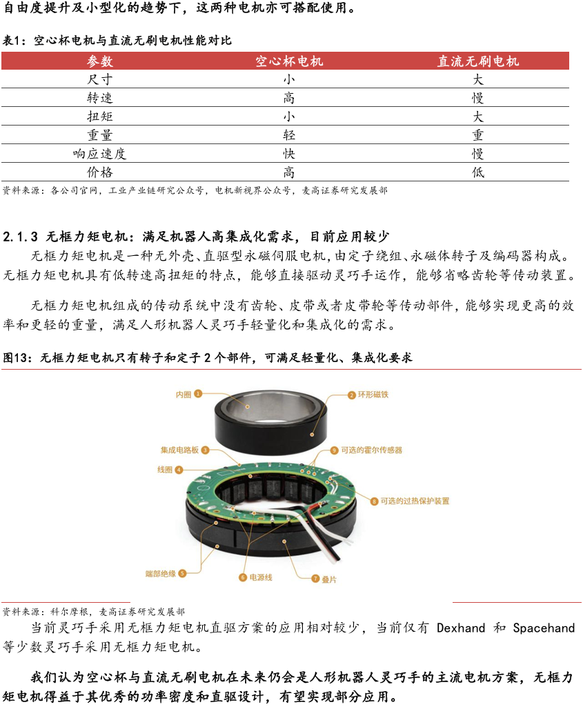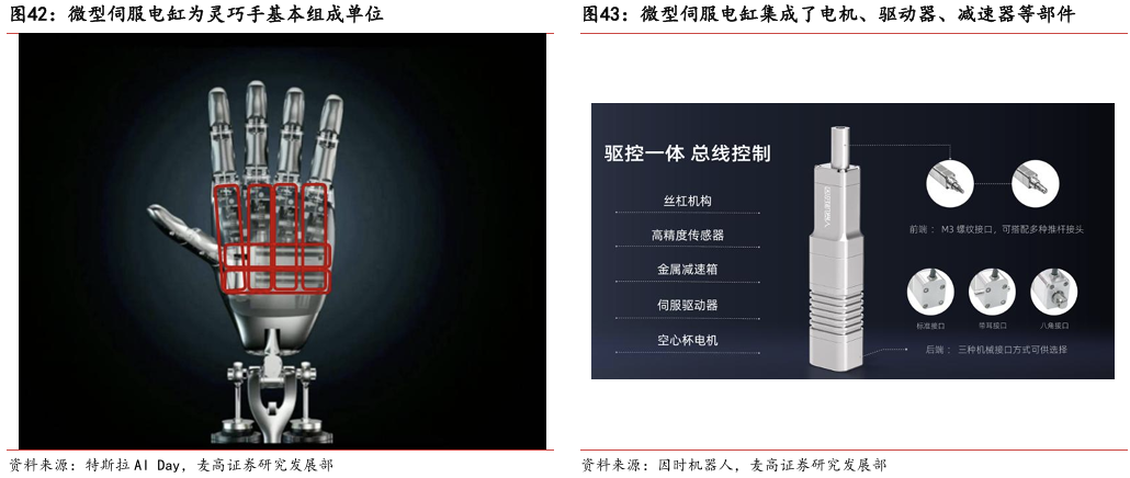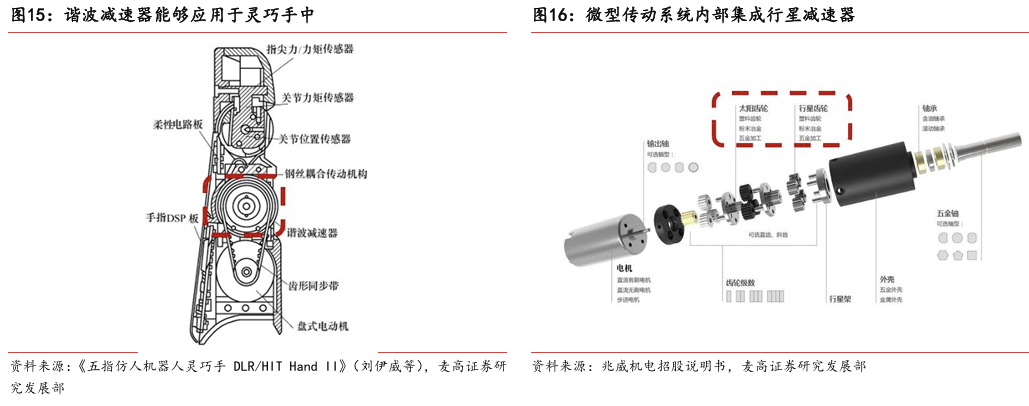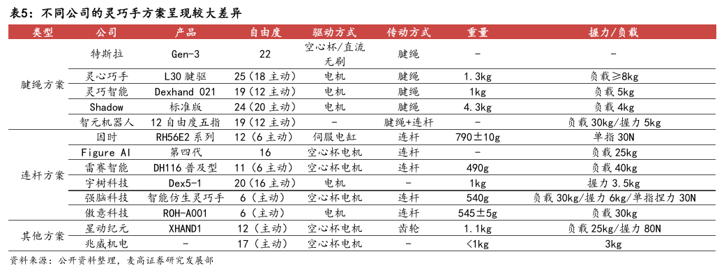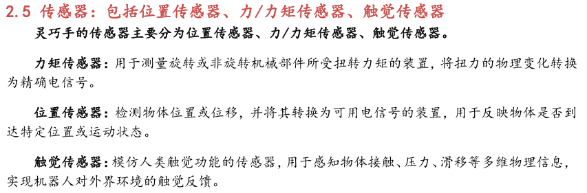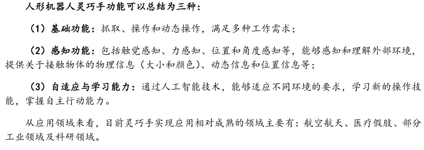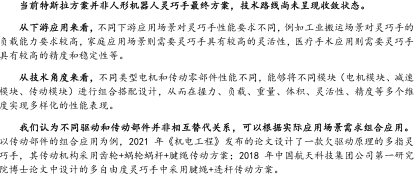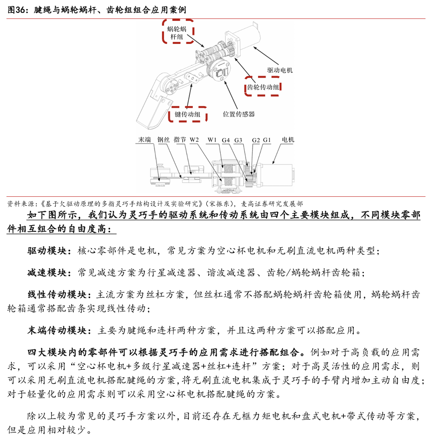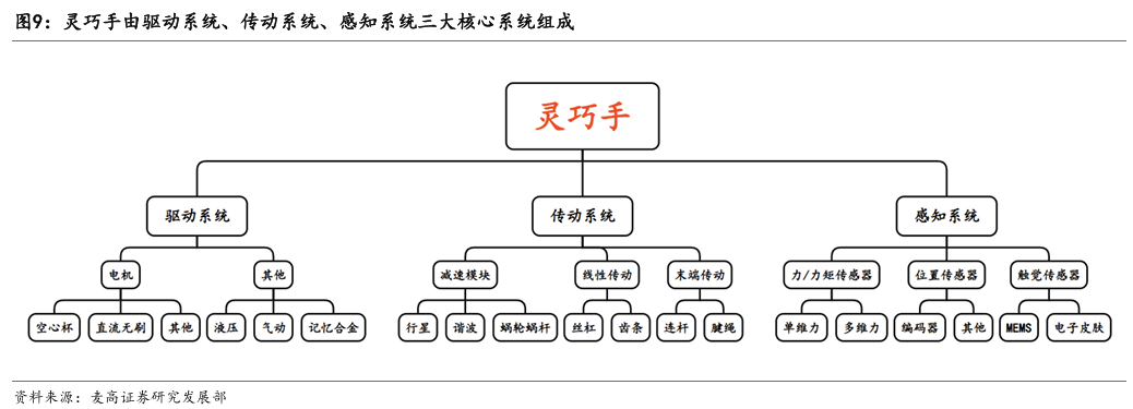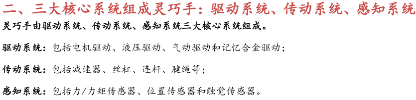 灵巧手由驱动系统、传动系统、感知系统三大核心系统组成。(1)驱动系统: 包括电机驱动、液压驱动、气动驱动和记忆合金驱动,电机驱动空心杯电机体 积小、转速高、功率密度大、响应速度快,是当前主流应用方案。(2)传动系统:包括减速模块、线性传动模块和末端传动模块,减速方案中行星减速器和 蜗轮蜗杆齿轮箱应用较多,微型谐波方案尚不成熟;微型丝杠中行星滚柱丝杠与滚珠丝杠均能够应用,但是行星滚柱丝杠体积相对较大,滚珠丝杠适配性更高;末端传动方案包括腱绳和连杆方案,腱绳方案节省空间适合高自由度灵巧手应用,连杆方案刚性更强负载更高。(3)感知系统:包括力矩传感器、位置传感器和触觉传感器,力传感以一维力为主,位置传感器以编码器为主,触觉传感器MEMS路线应用较多,未来电子皮肤用量有望提升。