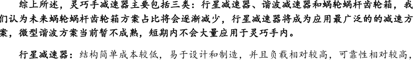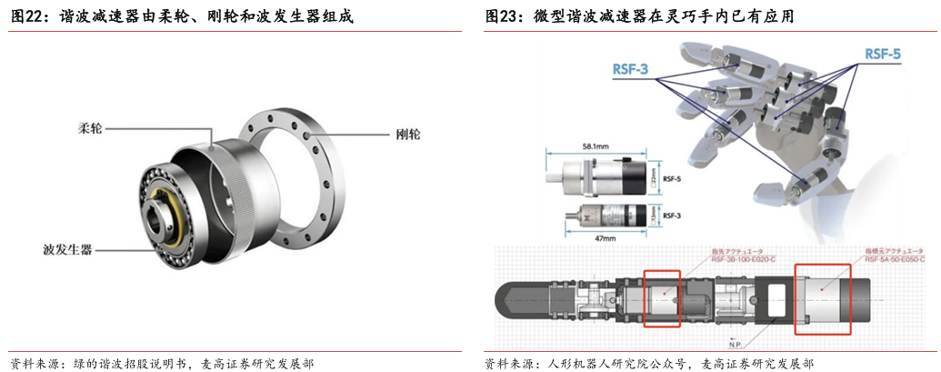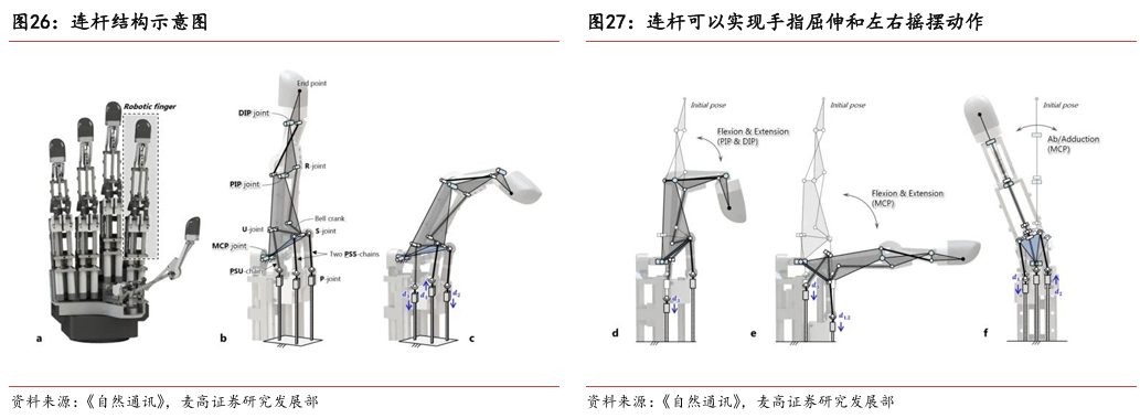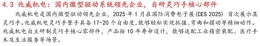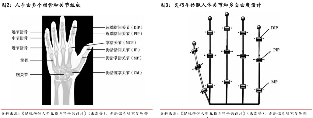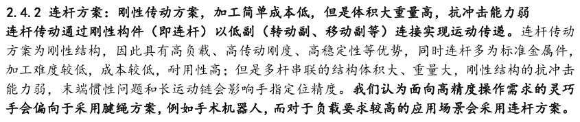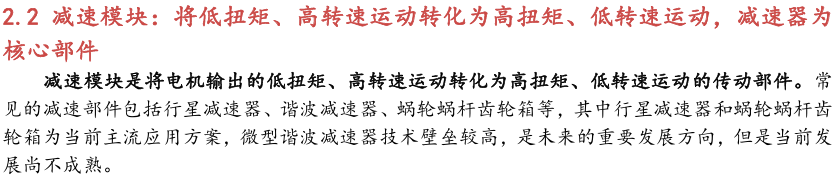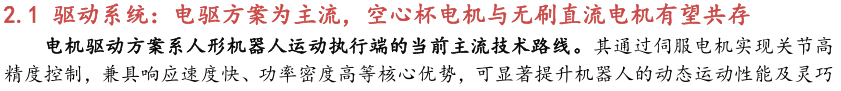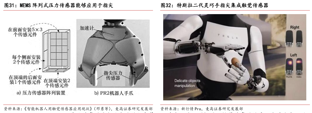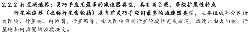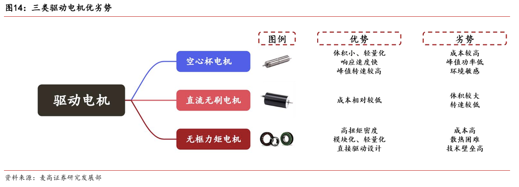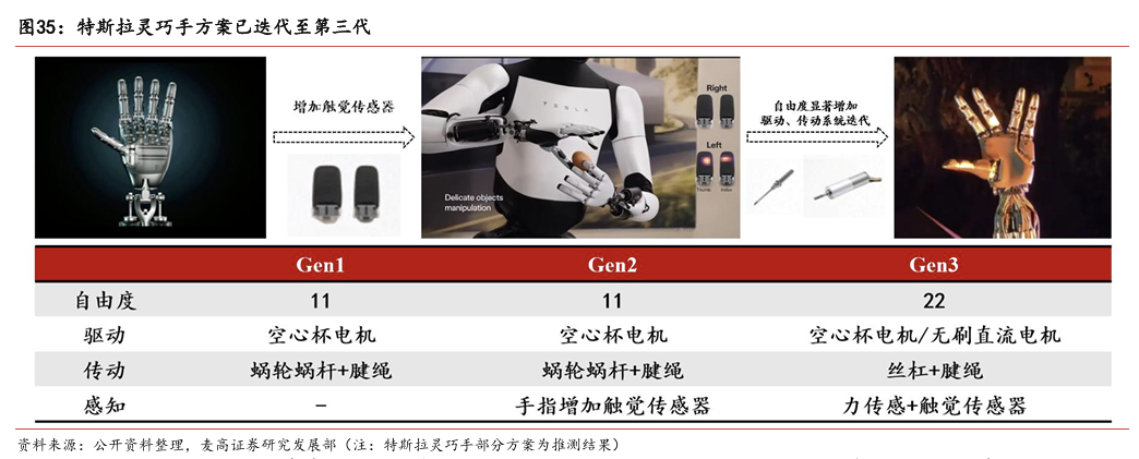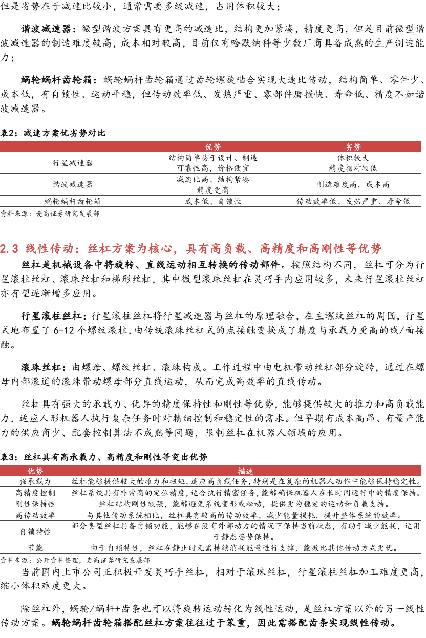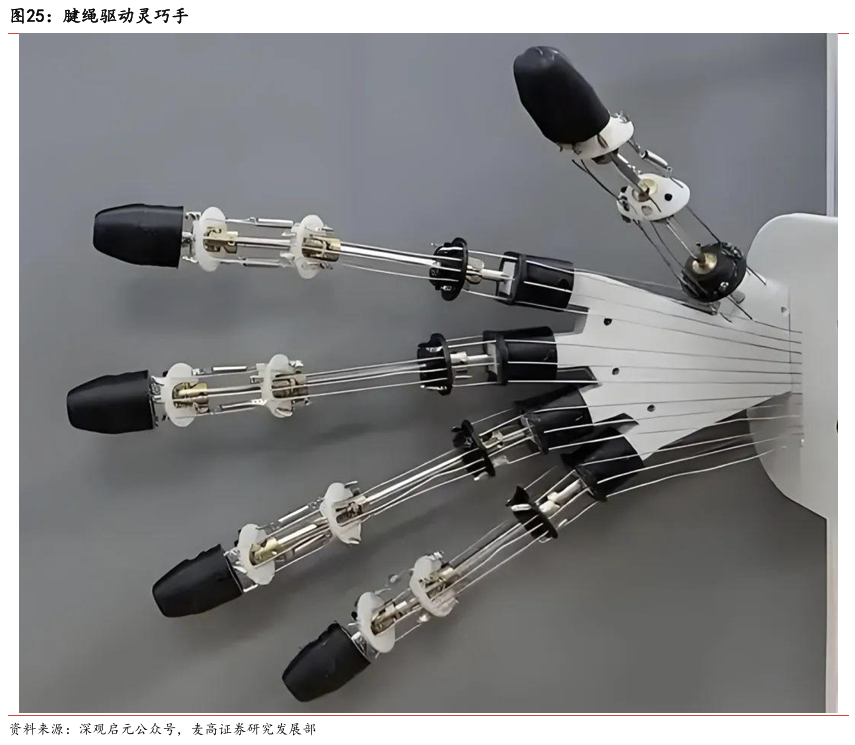 灵巧手由驱动系统、传动系统、感知系统三大核心系统组成。(1)驱动系统: 包括电机驱动、液压驱动、气动驱动和记忆合金驱动,电机驱动空心杯电机体 积小、转速高、功率密度大、响应速度快,是当前主流应用方案。(2)传动系统:包括减速模块、线性传动模块和末端传动模块,减速方案中行星减速器和 蜗轮蜗杆齿轮箱应用较多,微型谐波方案尚不成熟;微型丝杠中行星滚柱丝杠与滚珠丝杠均能够应用,但是行星滚柱丝杠体积相对较大,滚珠丝杠适配性更高;末端传动方案包括腱绳和连杆方案,腱绳方案节省空间适合高自由度灵巧手应用,连杆方案刚性更强负载更高。(3)感知系统:包括力矩传感器、位置传感器和触觉传感器,力传感以一维力为主,位置传感器以编码器为主,触觉传感器MEMS路线应用较多,未来电子皮肤用量有望提升。