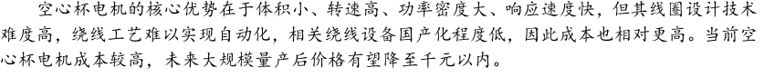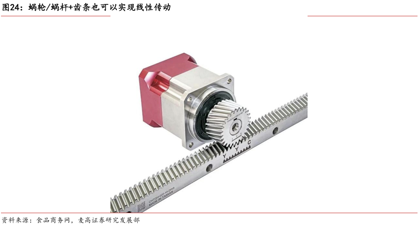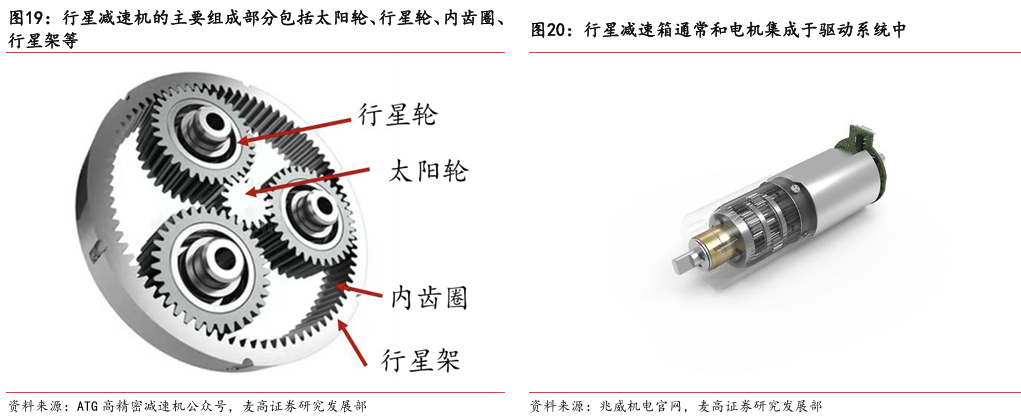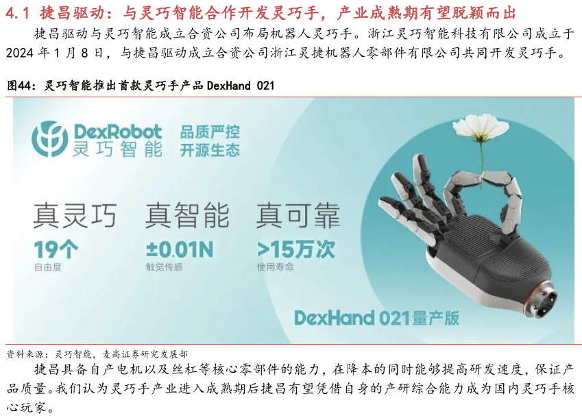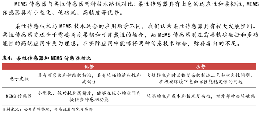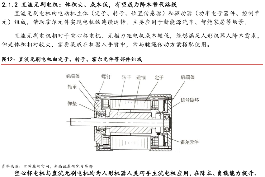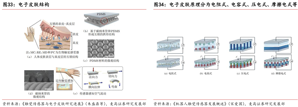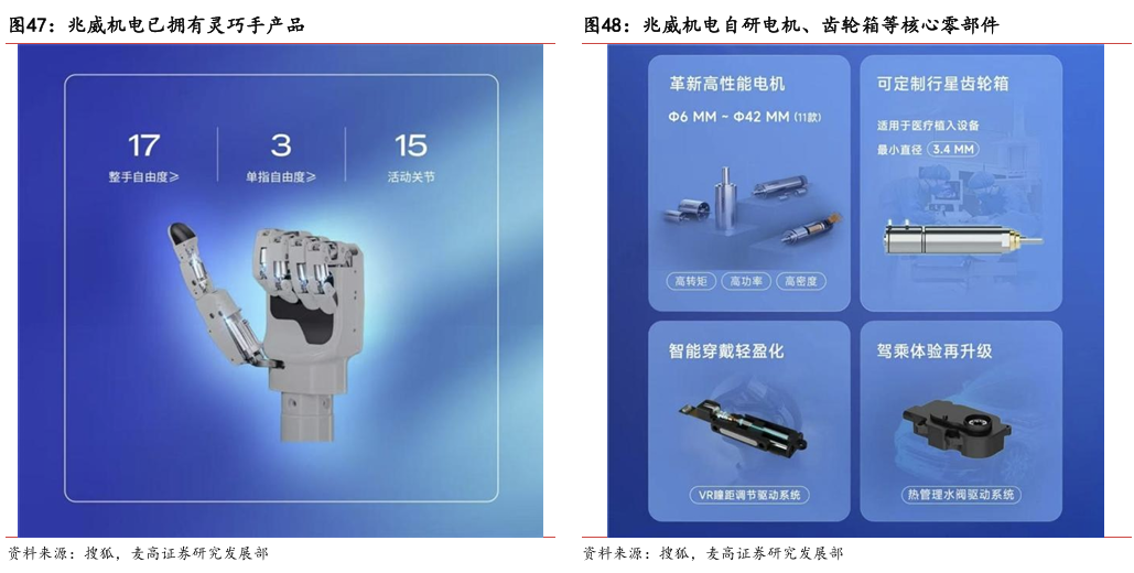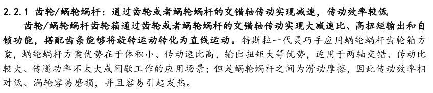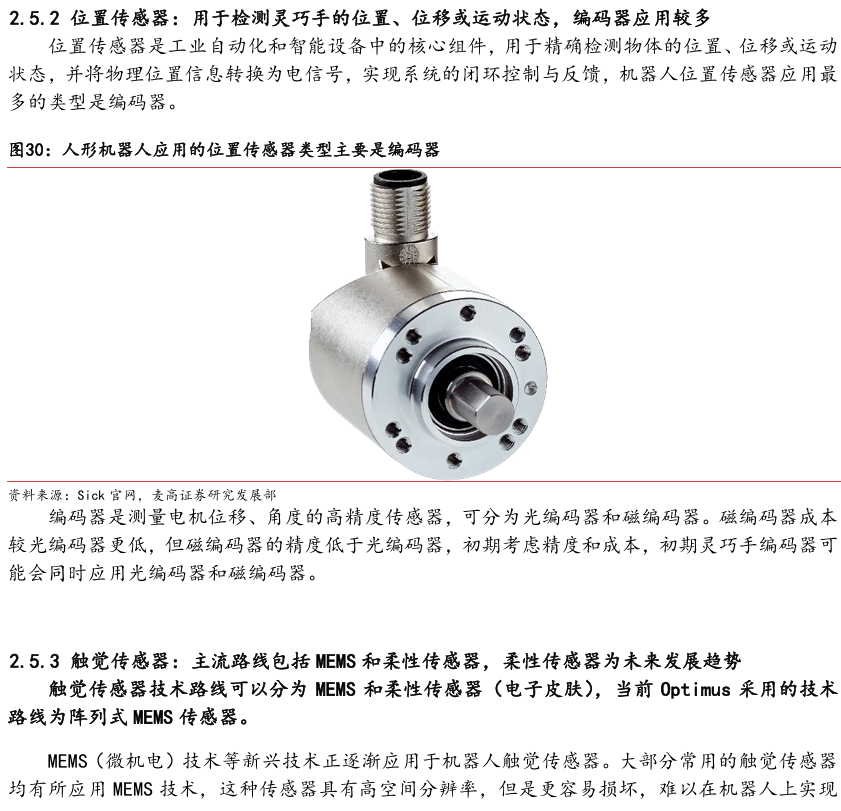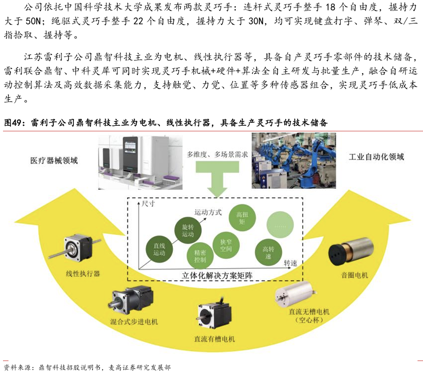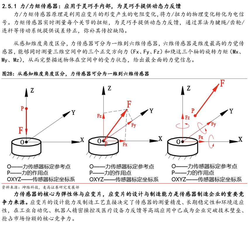 灵巧手由驱动系统、传动系统、感知系统三大核心系统组成。(1)驱动系统: 包括电机驱动、液压驱动、气动驱动和记忆合金驱动,电机驱动空心杯电机体 积小、转速高、功率密度大、响应速度快,是当前主流应用方案。(2)传动系统:包括减速模块、线性传动模块和末端传动模块,减速方案中行星减速器和 蜗轮蜗杆齿轮箱应用较多,微型谐波方案尚不成熟;微型丝杠中行星滚柱丝杠与滚珠丝杠均能够应用,但是行星滚柱丝杠体积相对较大,滚珠丝杠适配性更高;末端传动方案包括腱绳和连杆方案,腱绳方案节省空间适合高自由度灵巧手应用,连杆方案刚性更强负载更高。(3)感知系统:包括力矩传感器、位置传感器和触觉传感器,力传感以一维力为主,位置传感器以编码器为主,触觉传感器MEMS路线应用较多,未来电子皮肤用量有望提升。