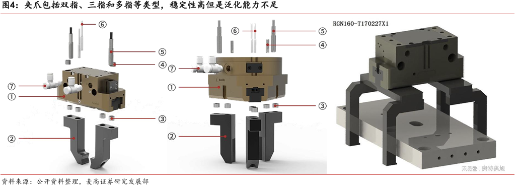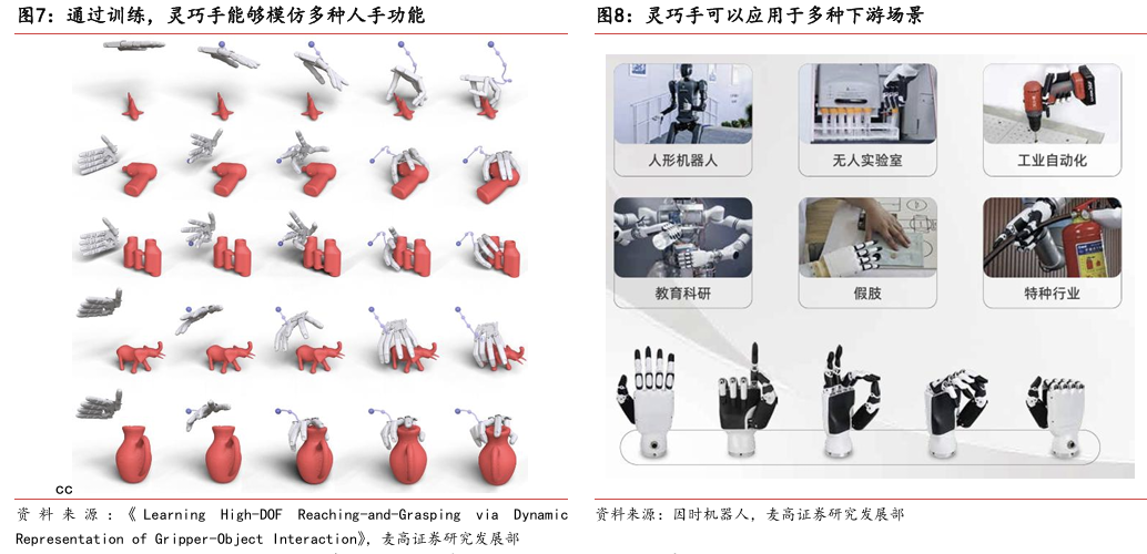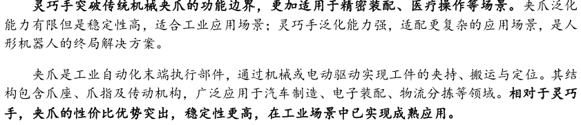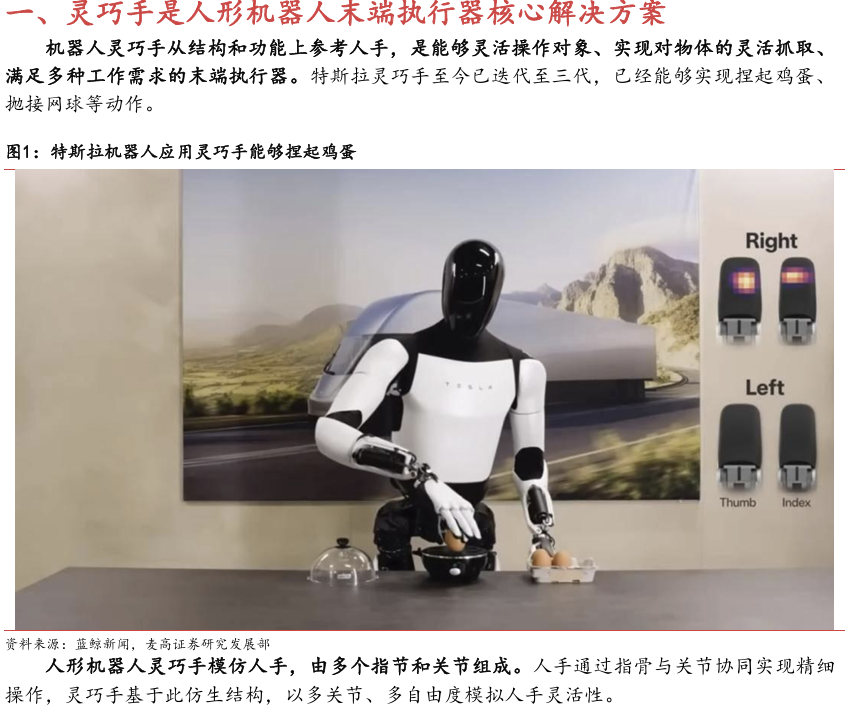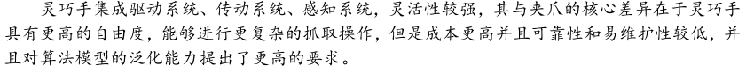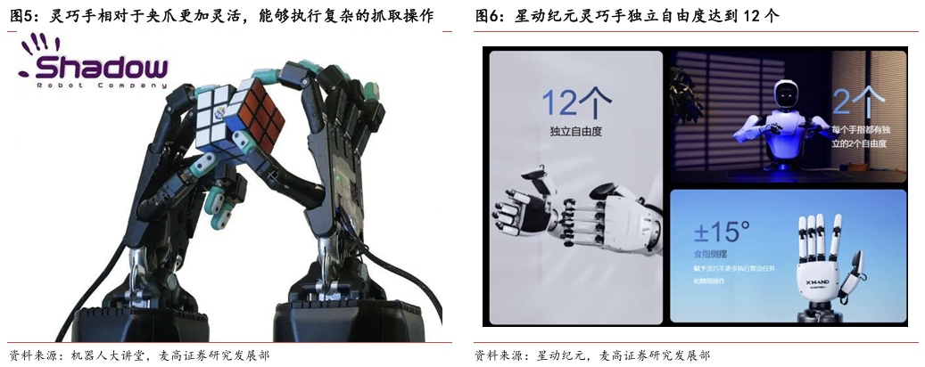 灵巧手是人形机器人末端执行器核心解决方案。灵巧手以人手为模仿对象,集 成驱动系统、传动系统、感知系统,灵活性较强,但是成本更高并且可靠性和 易维护性较低。灵巧手与夹爪的核心差异在于灵巧手具有更高的自由度,能够 进行更复杂的抓取操作,但是对算法模型的泛化能力提出了更高的要求。夹爪 泛化能力有限但是稳定性高,适合工业应用场景。灵巧手泛化能力强, 适配更复杂的应用场景,是人形机器人的优选解决方案。