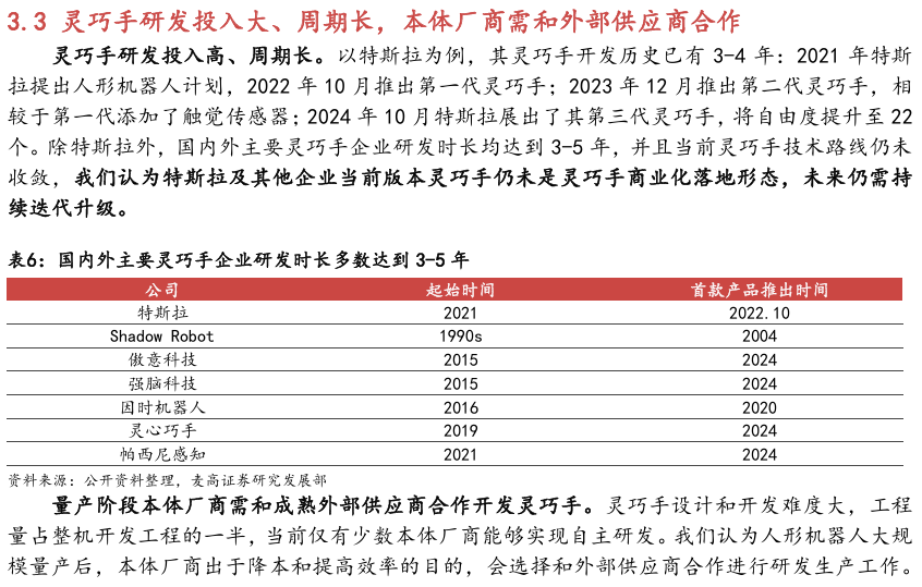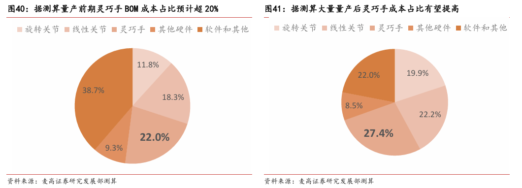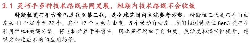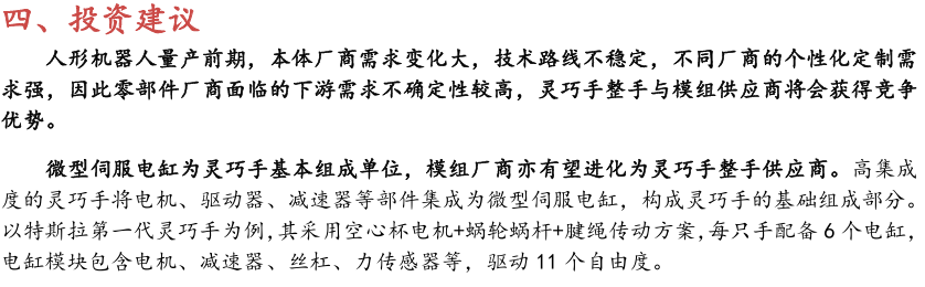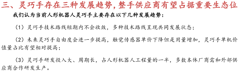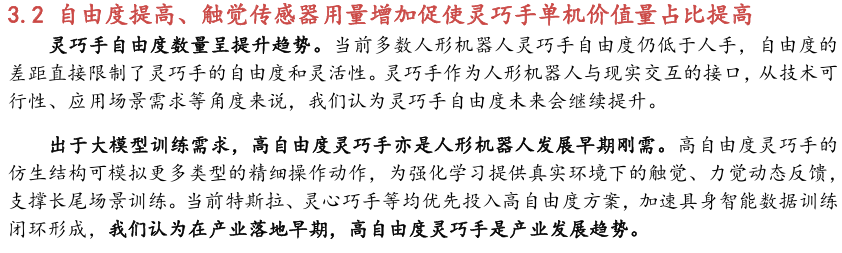 当前人形机器人灵巧手主要存在以下几种发展趋势:(1)灵巧手技术 路线短期内不会收敛,多种技术路线呈现共同发展状态;(2)未来灵巧手自由度会进一步提高,触觉传感器单价下降但是用量增加,灵巧手单机价值量占比有望相对提高;( 3)灵巧手研发投入大、周期长,占人形机器人工程量的一半, 因此多数本体厂商需和外部供应商合作。综上所述,人形机器人量产前期,本体厂商需求变化大,技术路线不稳定,不同厂商的个性化定制需求强,因此零部件厂商面临的下游需求不确定性较高,灵巧手整手与模组供应商将会获得竞争优势。