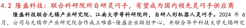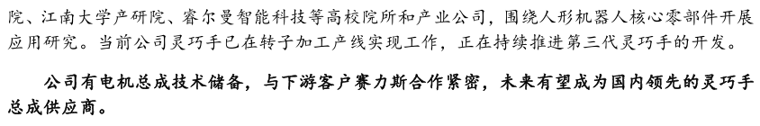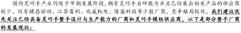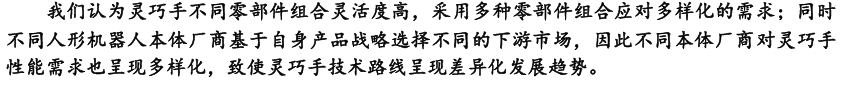 灵巧手是人形机器人末端执行器核心方案,当前技术路线尚未收敛,下游客户 个性化、定制化需求特征明显,整手和模组厂商将会获得竞争优势。
