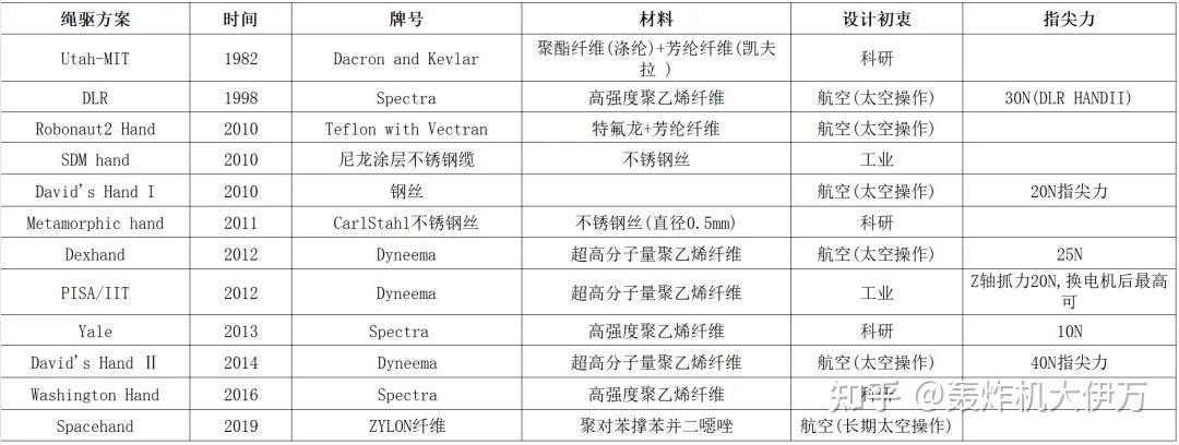 通过对已有腱传动灵巧手案例中腱绳材料的统计,我们发现: