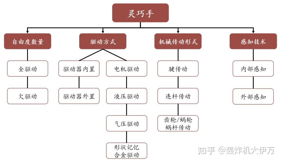 灵巧手种类繁多,可根据自由度数量、驱动方式、传动机构、感知技术等进行分类。