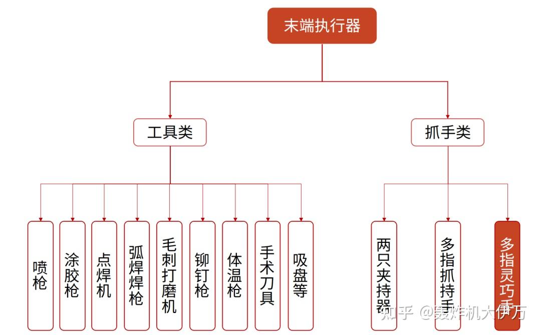 末端执行器 (End Effector) 是机器人执行部件的统称,一般安装于机器人腕部的末端,是直接执行任务的装置。末端执行器按其功能可以分为两大类,即:工具类和抓手类。工具类末端执行器是根据具体工作需求专门设计并预留标准化接口的机器人专用工具,可以直接实现具体的加工工种、生产工艺或日常动作;抓手类机器人末端执行器恰如人的双手,担负着执行各种动作、抓持和操作的任务。
