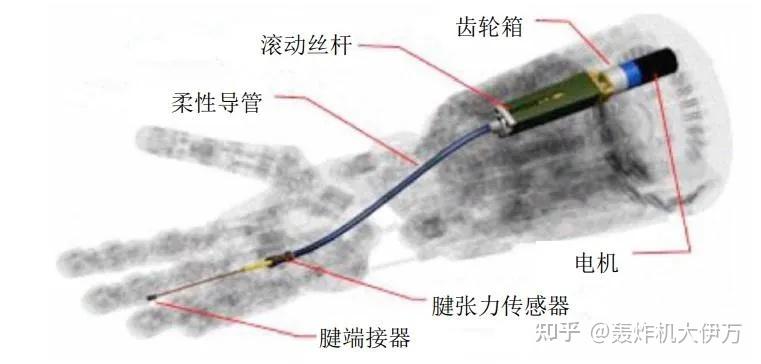 腱绳传动系统使用类似人类手指的腱和绳索结构,通过拉动或放松绳索来驱动手指的关节运动。一般电机通过齿轮箱驱动滚珠丝杠,通过滚珠丝杠上的螺母把旋转运动转换为直线运动,腱绳形成一个腱环套在螺母上,螺母拉动连接在灵巧手手指指骨上的腱绳,实现手指绕关节轴的转动运动。其中为了引导腱绳的走线,避免腱绳之间的干扰,采用腱绳外包裹导管的形式。相比连杆、齿轮等传动方式,腱传动对于空间狭小、传动精密的灵巧手空间设计较为友好,但传动效率与可靠性较差。