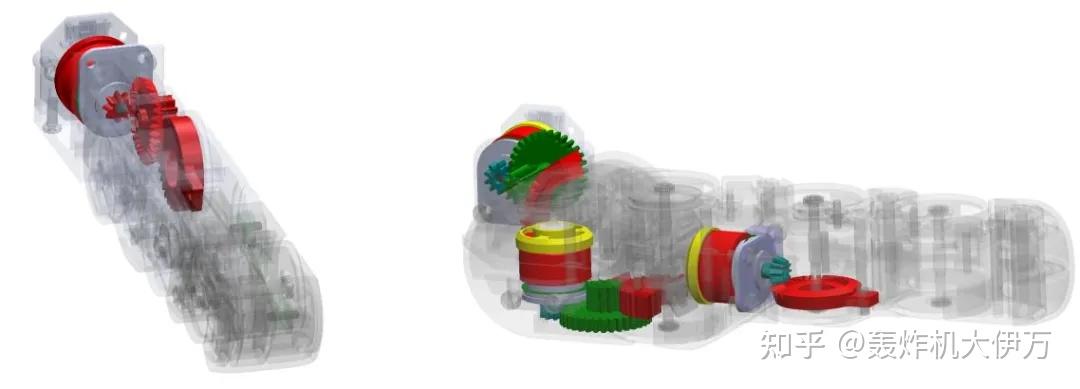 相对于腱传动方式,DLR II 手、GIFU II 手等采用齿轮、齿形皮带等直接传动的方法,具有腱传动无法比拟的优点:可靠性高、迟滞小等。同时,直接传动方式对驱动、减速结构与转动关节的空间位置有较高的要求,一般将电机、减速结构等集成在手掌或手指内部时,可以采用直接传动的方式。